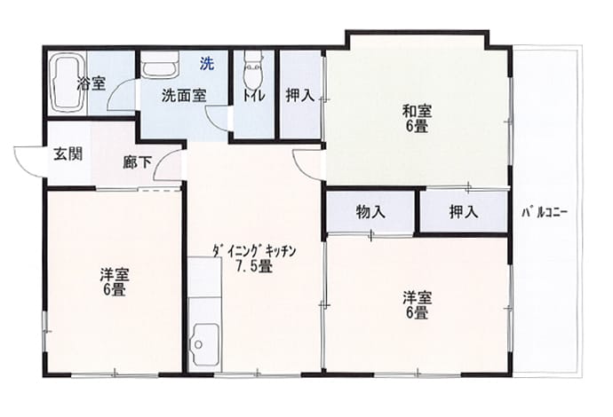 | 間取 | 3DK | 間取詳細 | 洋6×2・和6・DK7.5・バス・トイレ・バルコニー |